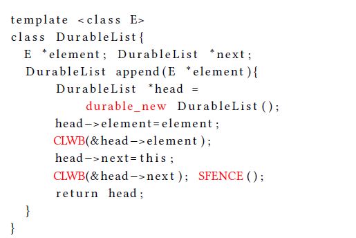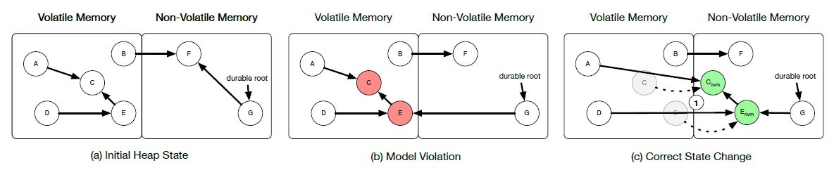 This paper presents AutoPersist, a Java NVM programming interface aimed to minimize programmer burden. Existing NVM programming interfaces such as PMDK require programmers to identify and label all persisten objects, such as shown in Figure 1. (As an aside, I don’t believe the code shown in Figure 1 is crash consistent, because there is no SFENCE between the two CLWBs.) The authors argue that this approach is susceptible to correctness bugs and reduced performance, as it is easy for programmers to mislabel the persistent objects. AutoPersist only require user to identify durable root, the entry pointers to persistent data structures. The framework then automatically ensures that all objects reachable from the durable root are automatically stored and updated to the NVM.