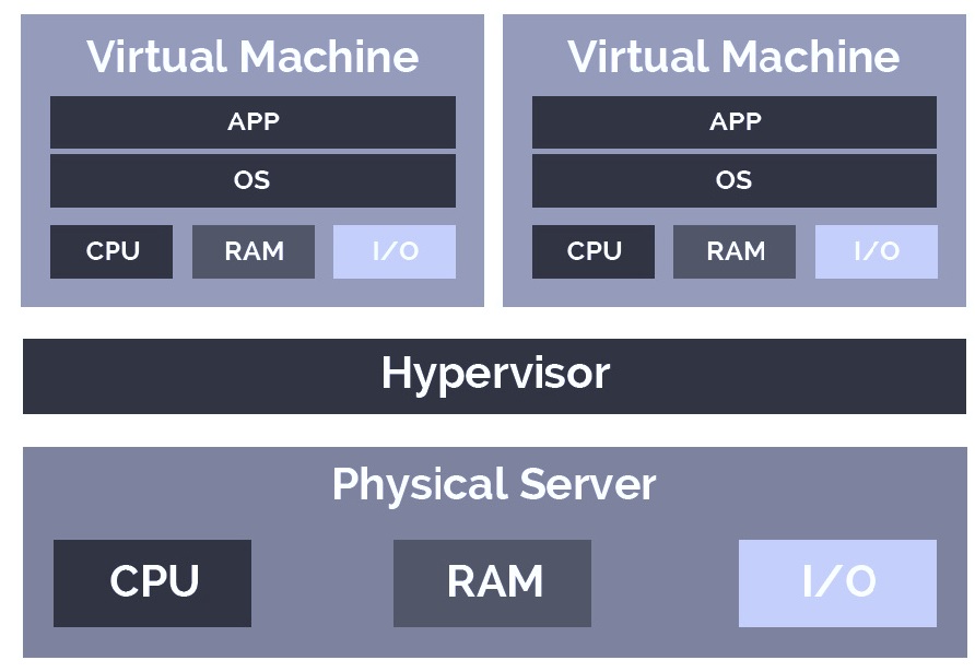 Figure 1: Server virtualization. The hypervisor is running two VMs on top of a single physical server [1].