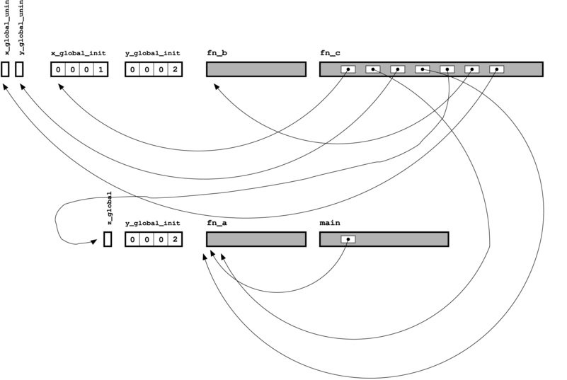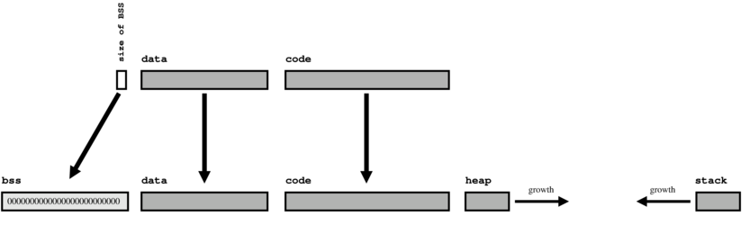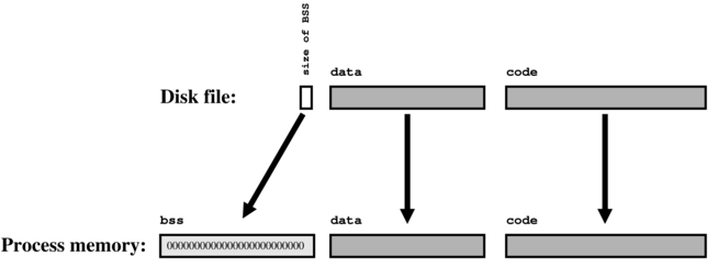 Uninitialized global variables are assumed to be 0 at the start, so there is no need to copy values into the memory. This chunk of memory that is initialized to 0 is the bss segment, where bss stands for block starting symbol. This also means that we can save disk space by compressing the uninitialized global variables: