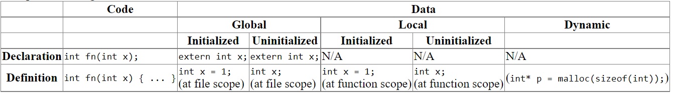 - Declaration: tells the compiler that the definition of this name exists somewhere else, probably in another C file. (A definition is also a declaration, where the “somewhere else” is here).