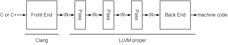 - Another LLVM’s novelty is that it uses the same IR format throughout the process, as opposed to other compilers that uses different formats for each pass.