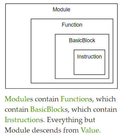 - Function, BasicBlock, and Instruction all inherit from a base class called Value. A Value is any data that can be used in a computation.