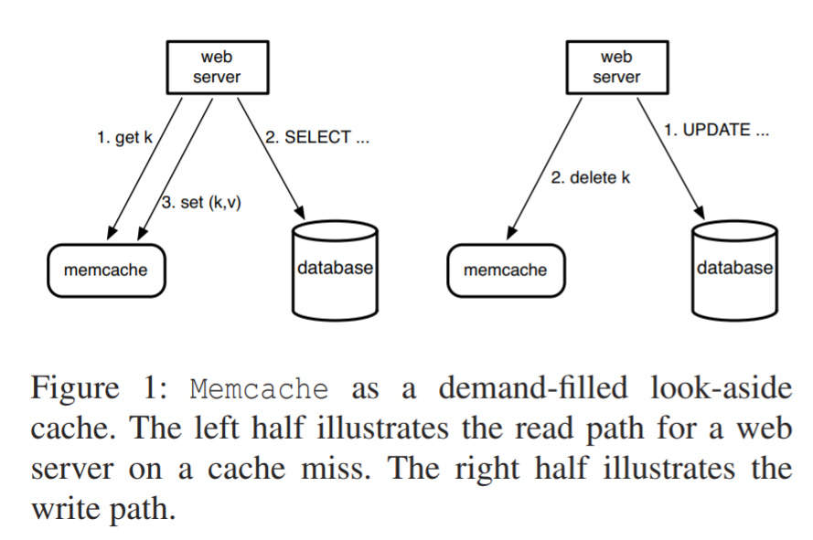 Facebook uses memcache as a demand-filled look-aside cache, as shown in the figure below. Upon a read miss, the web server retrieves data from db and adds the entry to the cache. Upon a write, the server directly writes to the db and deletes the entry in cache. The paper says they delete instead of update because deletion are idempotent, which means f(x) == f(f(x)). I am guessing they mean they do not have to worry about data consistency.
