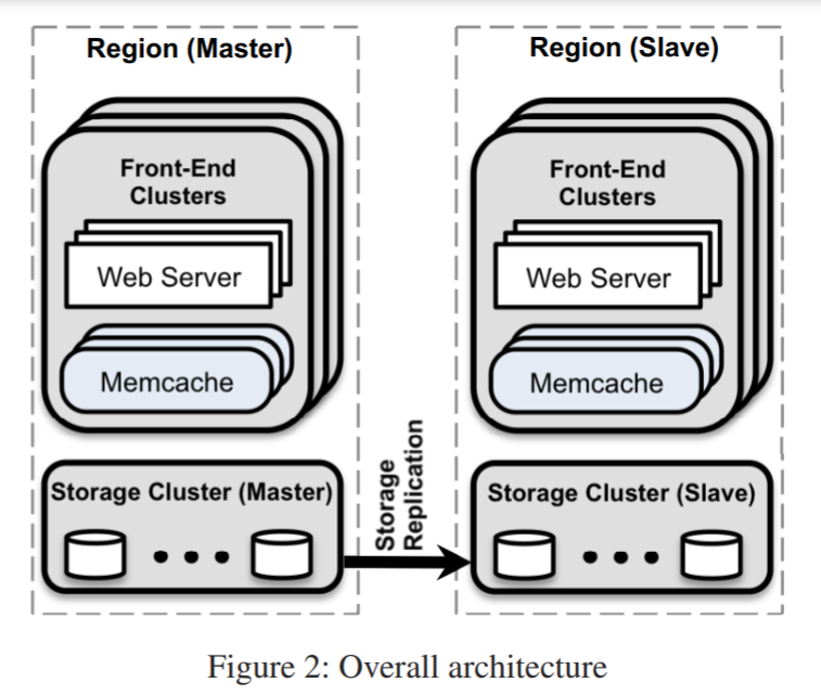 The below figure shows FB’s memcache architecture. Each region is placed in a different geographical area. Within each region, there are multiple web server + memcache clusters and one shared storage cluster.