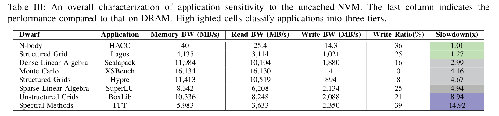 The next table is interesting. It shows some observations on why certain benchmarks perform worse when migrated to uncached-NVM (KMEM DAX). The two metrics that make an application perform badly on NVM are high memory BW and high write BW. BoxLib has both, so it is straight up gg. Between these two metrics, write BW seems to play a bigger role (see FFT).
