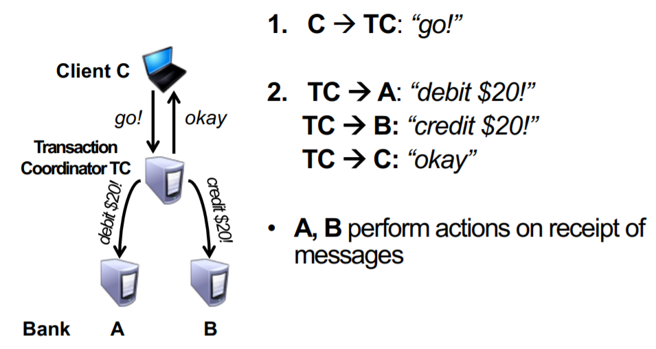 This obviously does not work, if ex. A doesn’t have enough money, so A aborts but B proceeds. A crashes before receiving the message, so only B performs the action. The coordinator crashes just after taking money from A but before giving money to B.