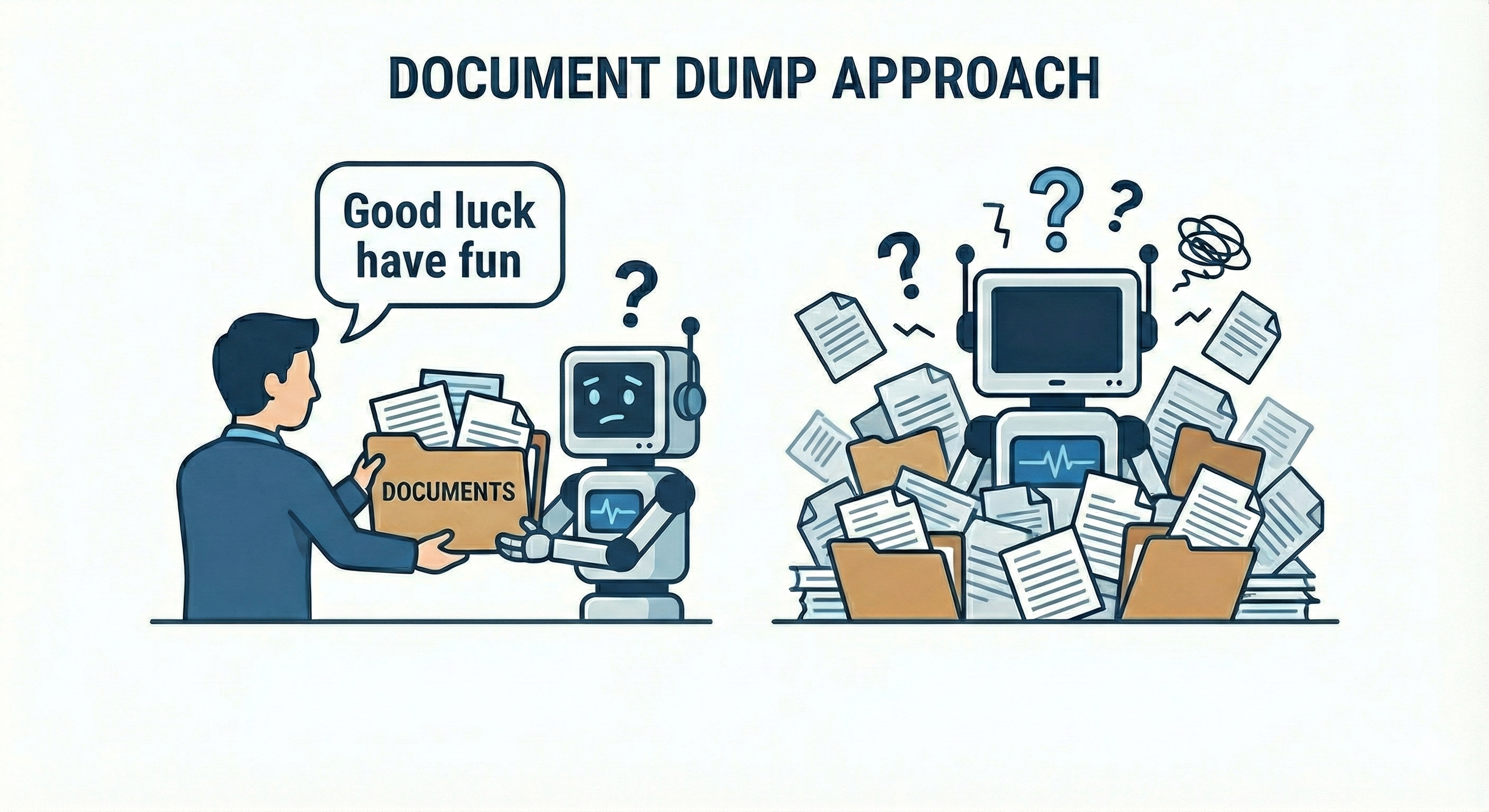 An analogy: it’s like onboarding a junior engineer by handing them a folder of documents and saying “good luck.” The most critical part of knowledge transfer, synthesizing this “raw” information into usable knowledge, is pushed entirely onto the learner. This is the “document dump” approach: dump your docs and hope the agent works.