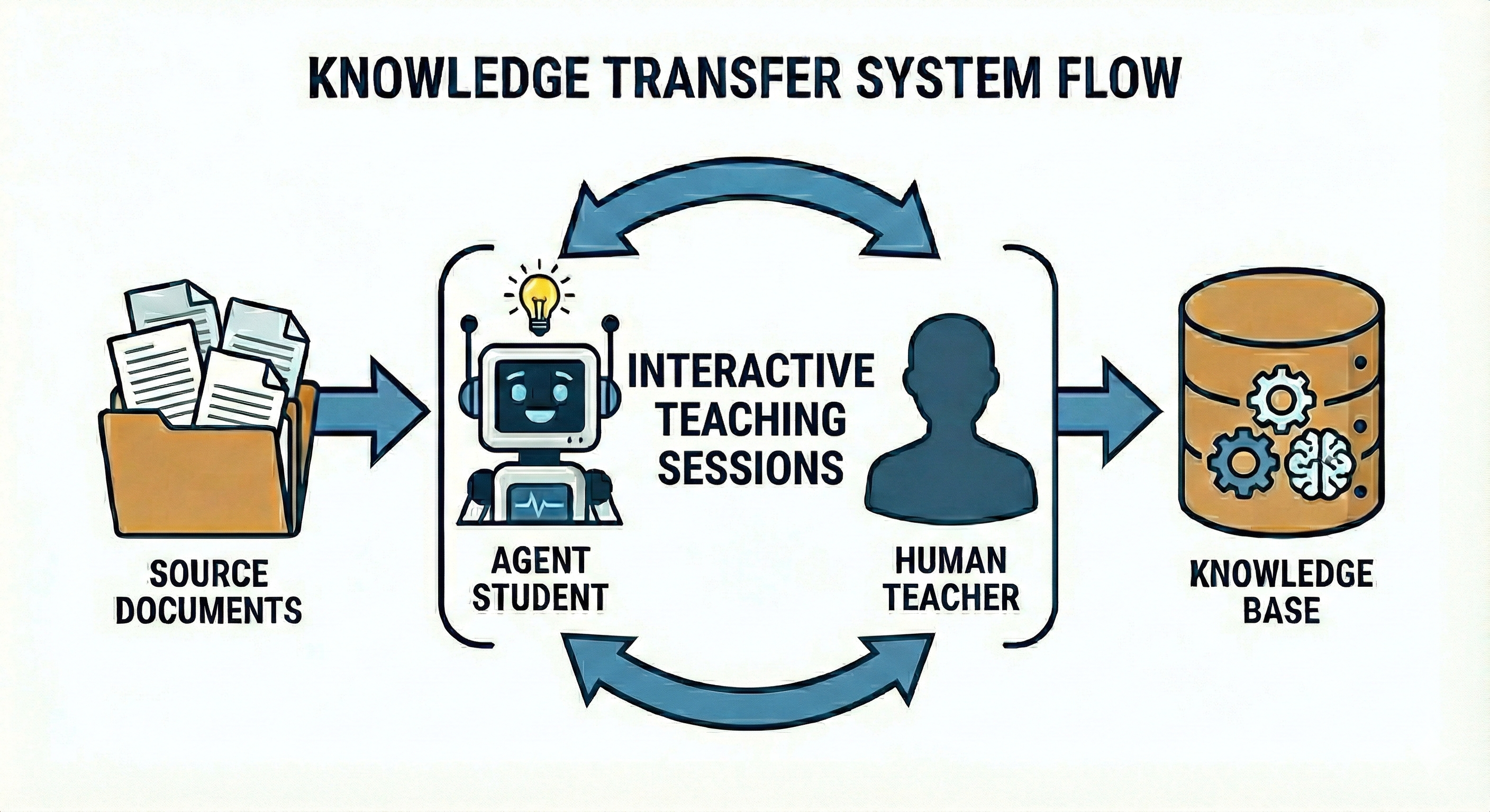 The inputs to the system are source documents. In practice, these can be anything that contain domain knowledge: design docs, code, meeting notes, daily logs, past chat transcripts, etc. These are things that you previously would have put into a RAG/document dump. Teaching happens through chat sessions between the human user and the agent student. The agent maintains and updates a knowledge base (in plain text) based on information received from the human teacher.