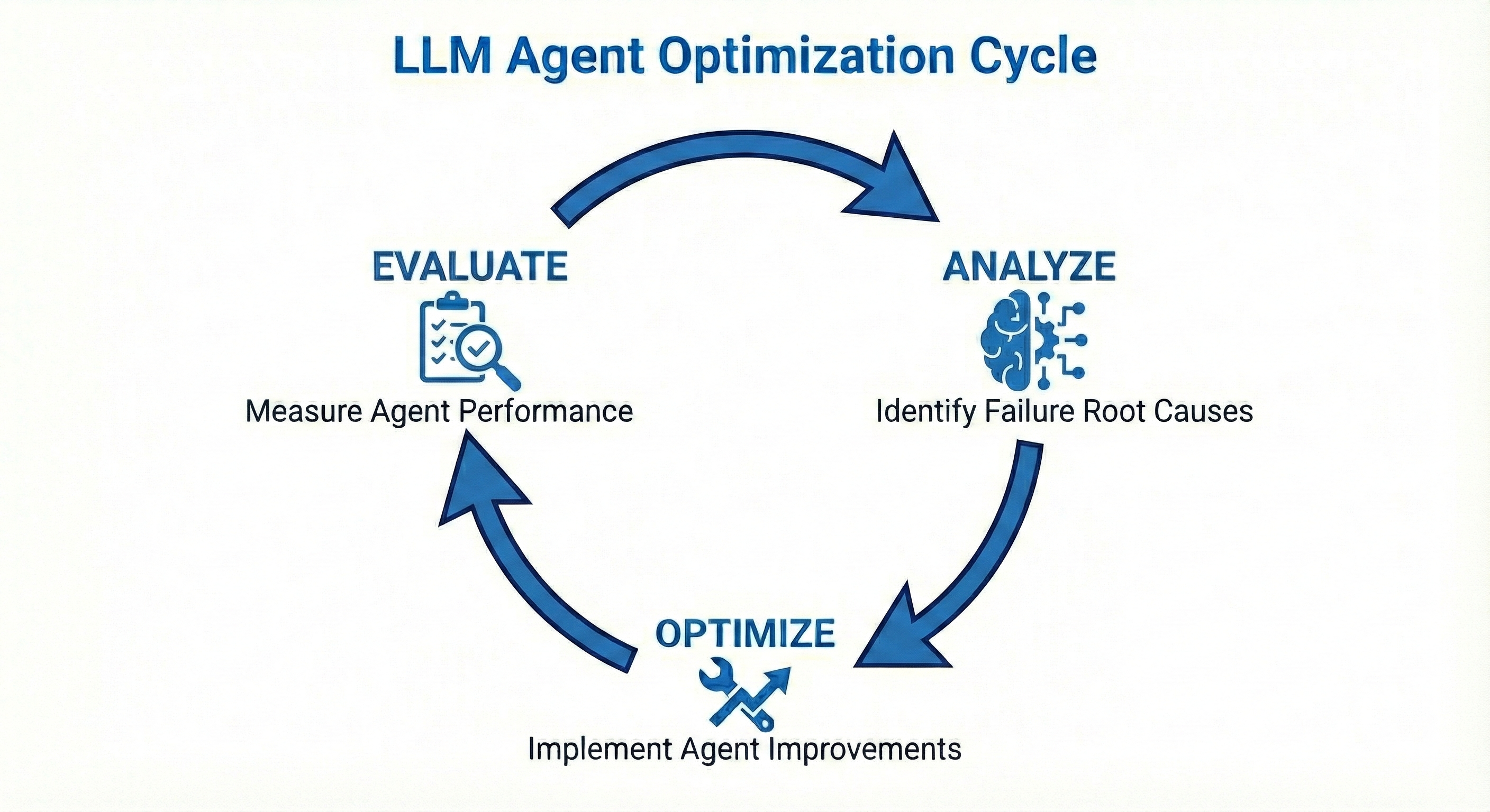 Conceptually, optimizing an agent is an iterative process with three stages: Evaluate, Analyze, Optimize.